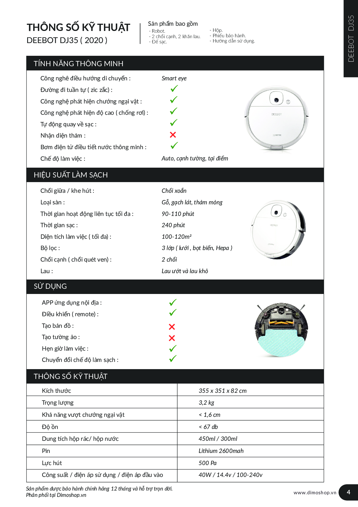 – Tự động hút bụi trong phòng: Được đánh giá là một robot thông minh và mạnh mẽ, sở hữu nền tảng trí tuệ nhân tạo, Ecovacs Deebot DJ35 có thể hiểu rõ từng căn phòng, từng ngóc ngách cần dọn dẹp. Nhờ vậy, nó có thể tạo lập một lộ trình hợp lý để không chạy lòng vòng, không bỏ sót khu vực bị bẩn, không lặp đi lặp lại ở cùng một vị trí,…