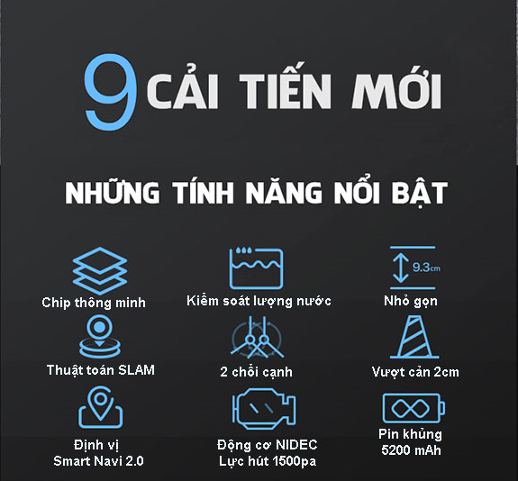– Động cơ NIDEC nâng cấp tích hợp với cây lau chùi được thiết kế hình chữ V nổi trội, lực hút 1500pa